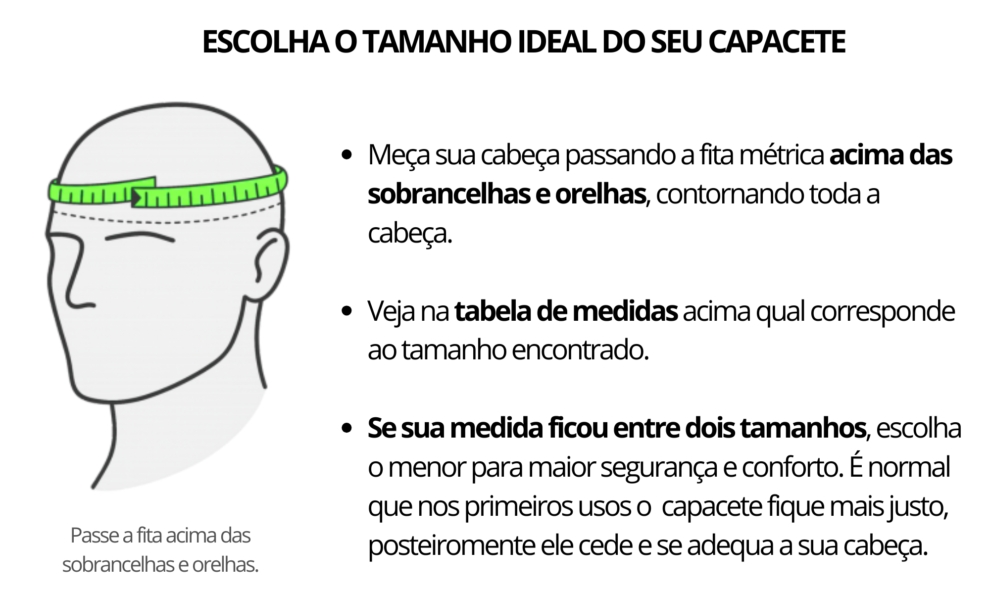 Para garantir segurança e conforto, o capacete deve ficar justo, sem apertar excessivamente. Nos primeiros dias, é normal sentir o capacete mais firme nas bochechas. Com o uso, o forro se ajusta ao formato do rosto, tornando-se mais confortável.